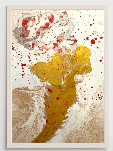 Faith is intertwined through and is the driving force for everything that I do. Desiring to embody the sound of a heavenly alarm, the sound of freedom, the sound of a people being called by Jesus Christ...'The Sound' was born. There is something supernatural about metallics, and red simply commands attention. Allow the white and gold with peeks and splashes of red, brown, and gray to complete your space. 24x36" - 500 USD